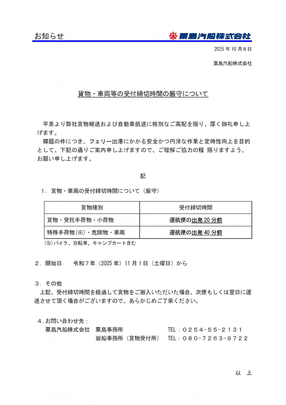 - 2025/10/08|貨物・車両等の受付締切時間の厳守について