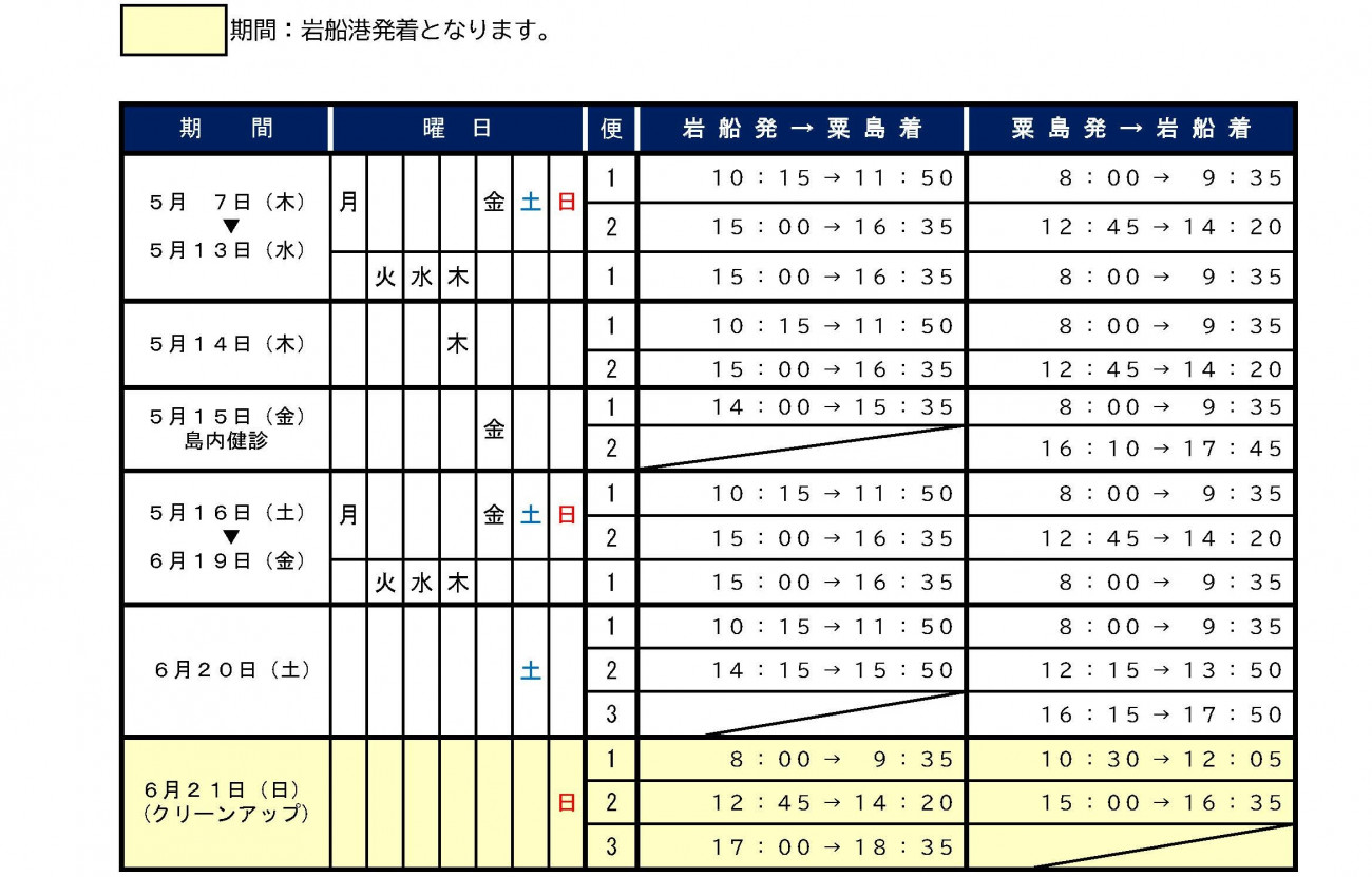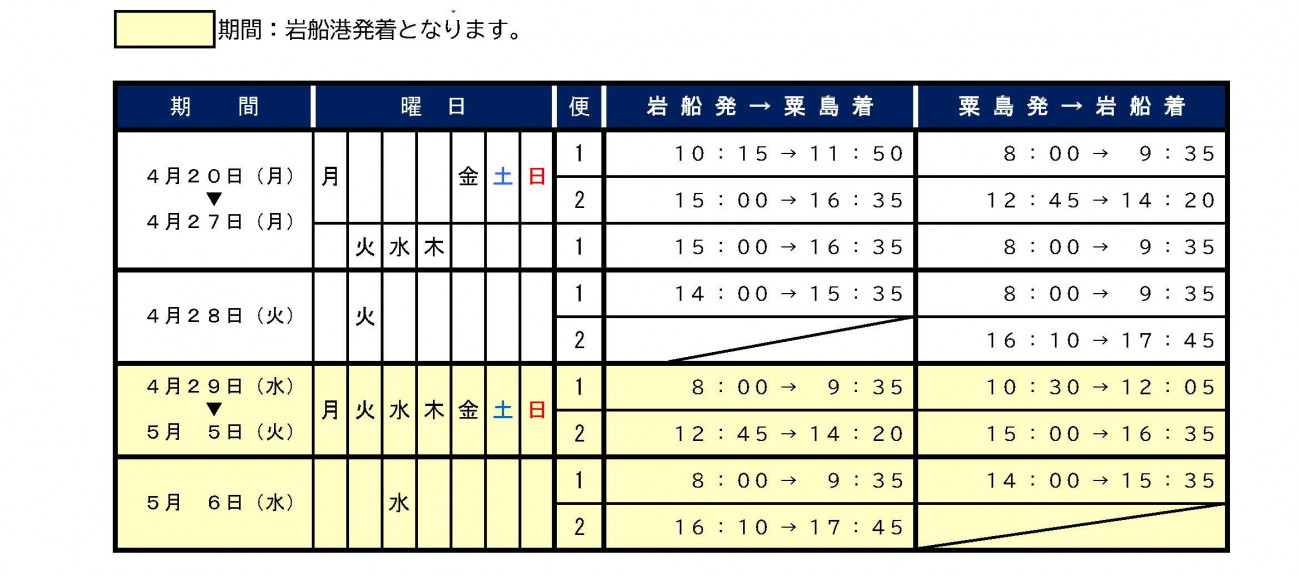 | 期 間 | 便 | 岩船港 → 粟島港 | 粟島港 → 岩船港 | |