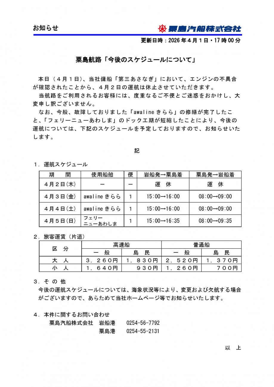 本日、当社で傭船をしています第三あさなぎにおいて、エンジンの不具合が確認されたことから、明日4月2日の運航は休止させていただきます。