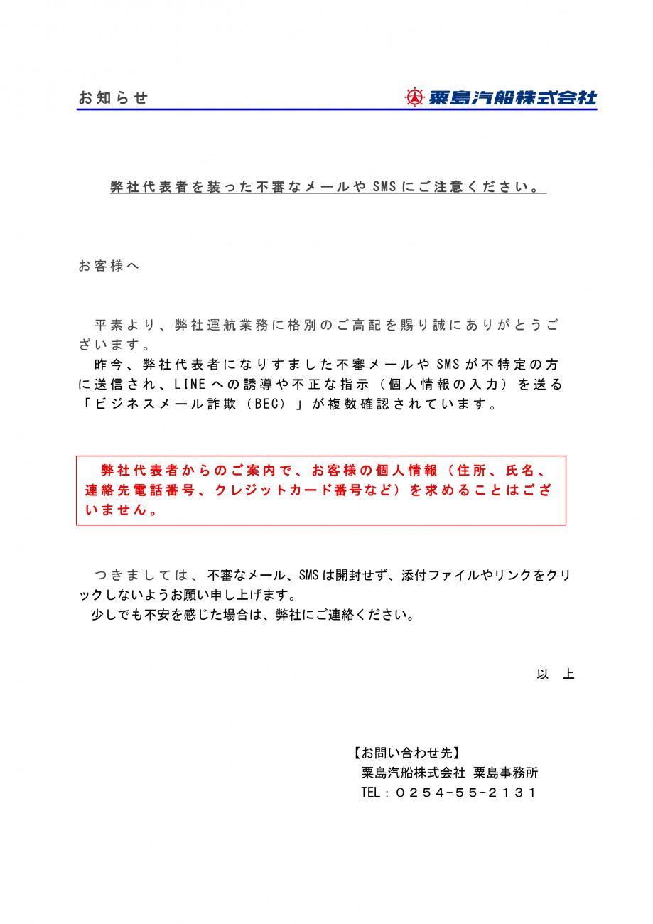 お知らせ 不審なメールやSNSにご注意ください