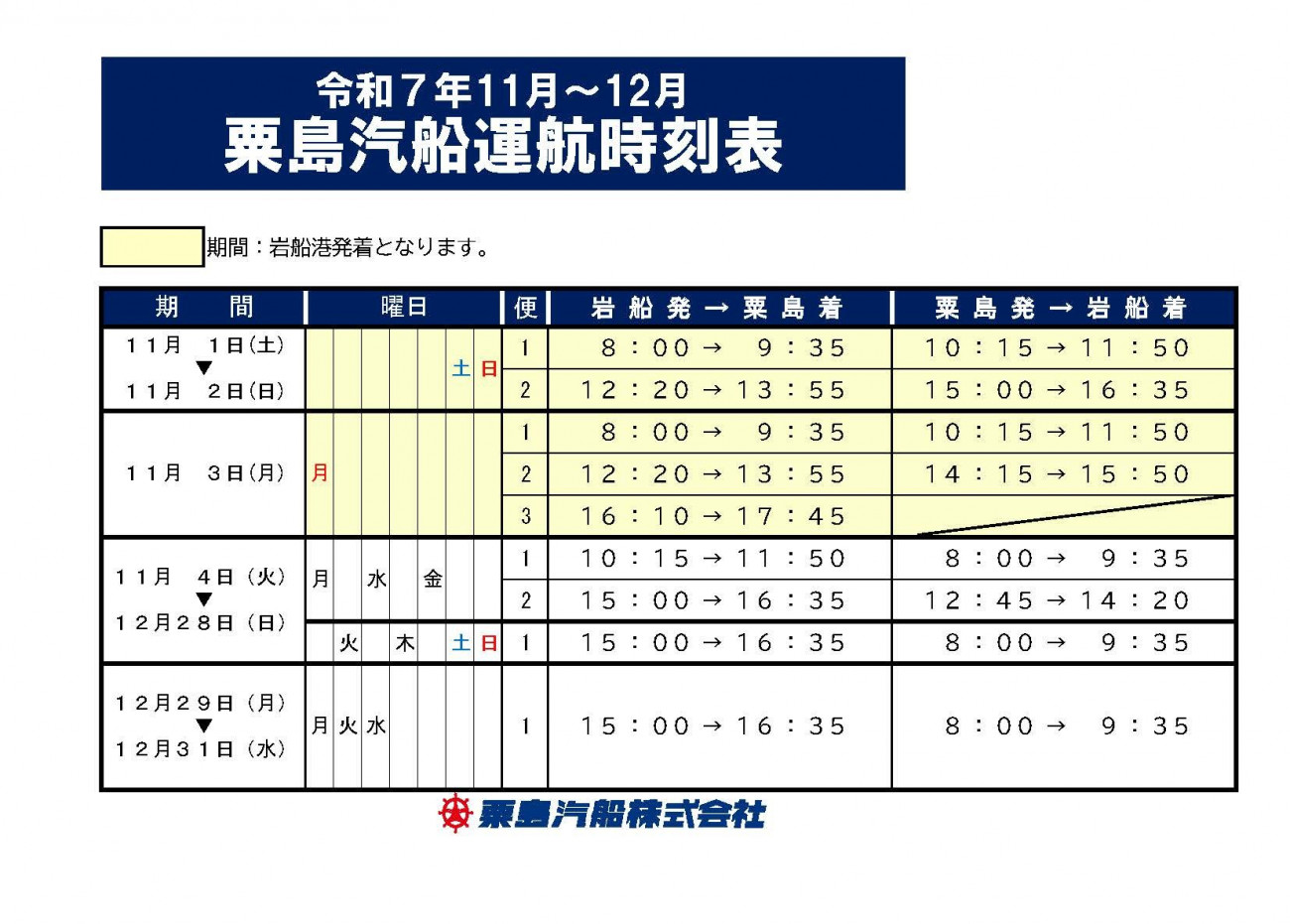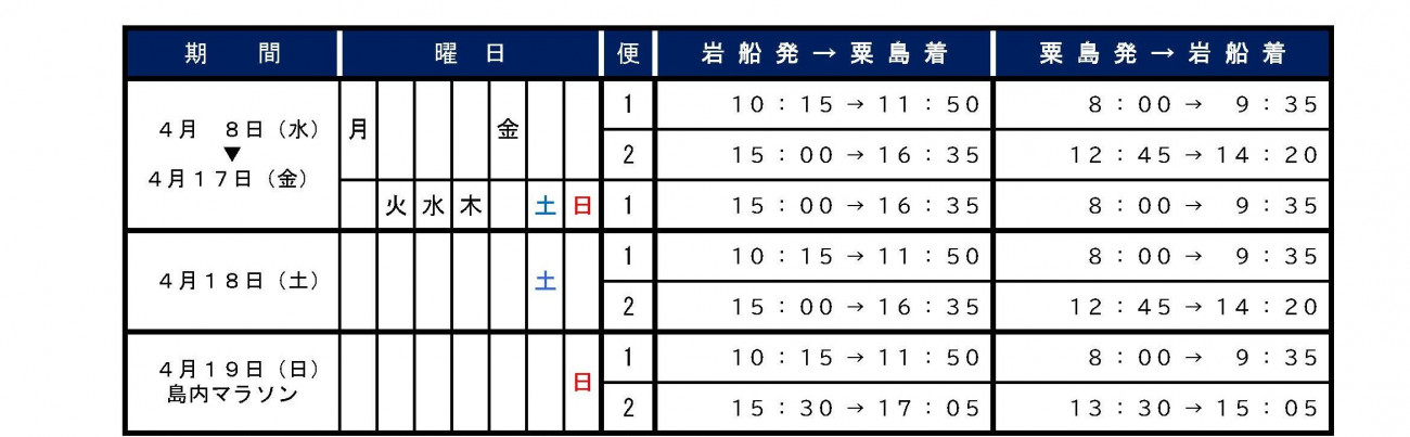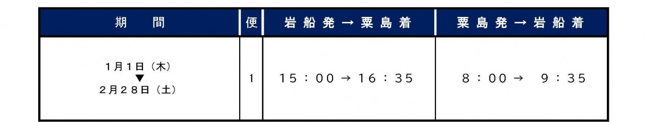 | 期 間 | 便 | 岩船港 → 粟島港 | 粟島港 → 岩船港 | |