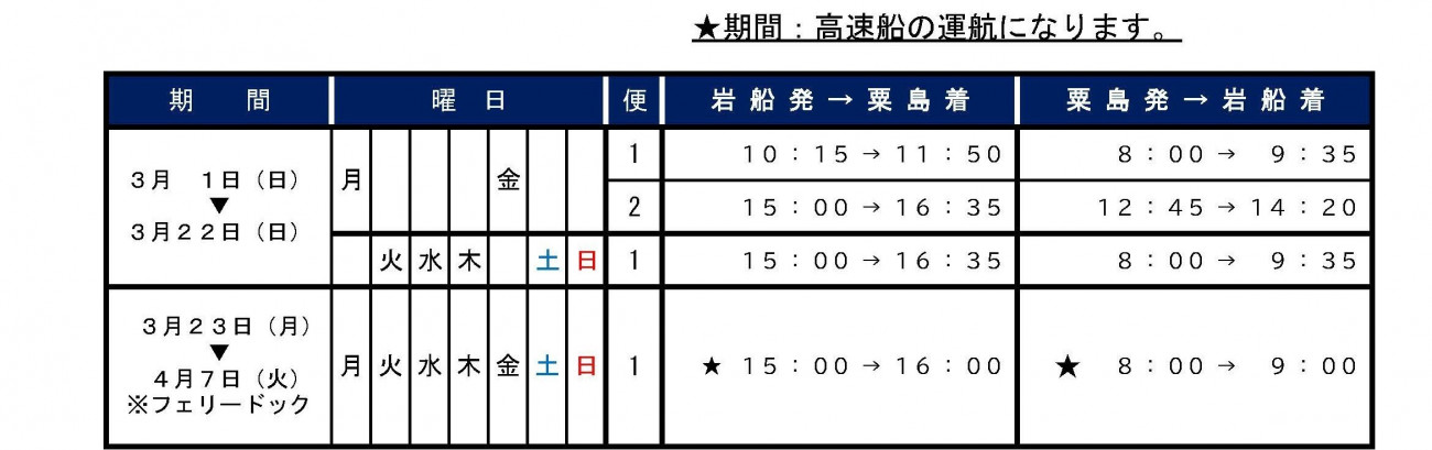 | 3月23日(月) ~ 4月7日(火) フェリードック期間 | 1 | 15:00 | 08:00 | |